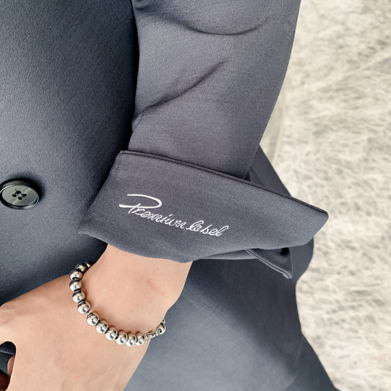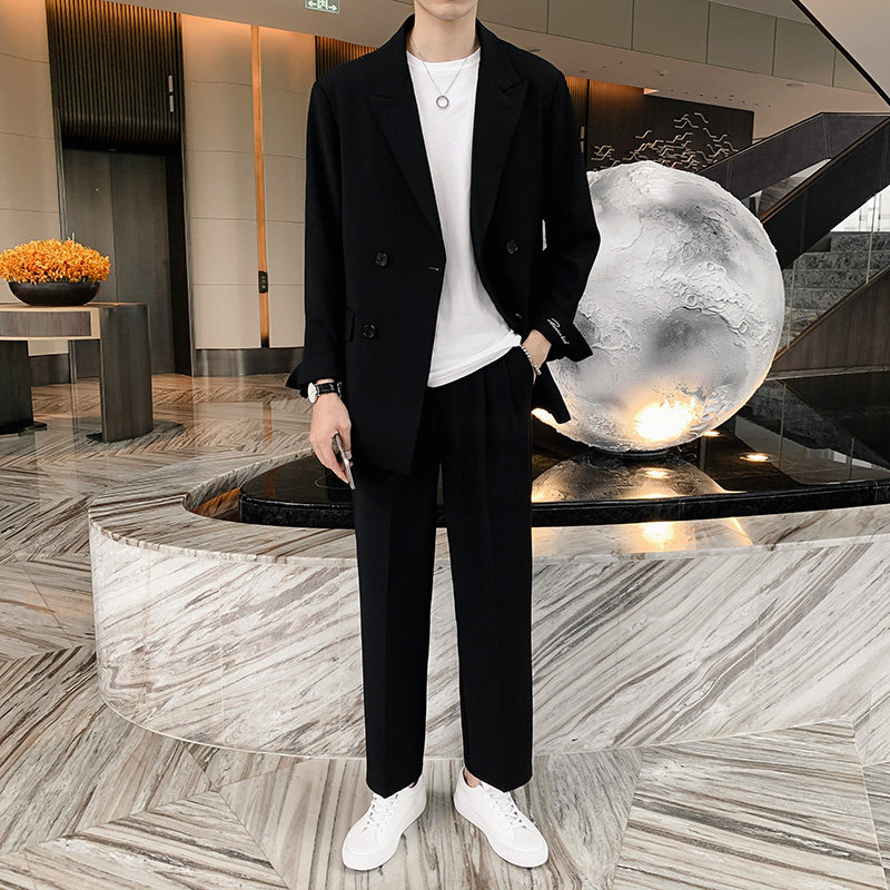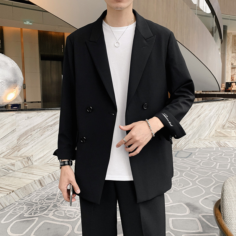 Korean version loose with long style double-row buttoned wind clothing male net red embroidered small suit jacket handsome and broadlegged pants suit tide