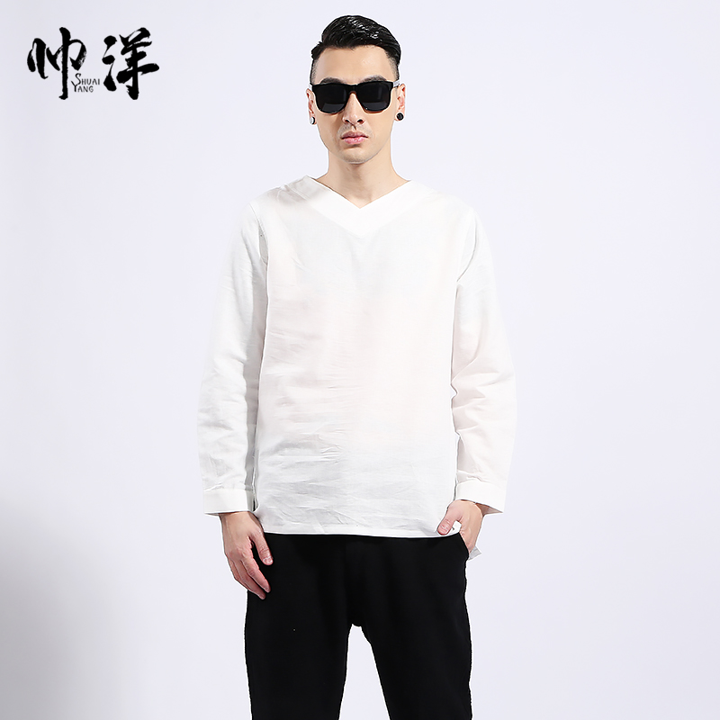 (break code) Chinese wind cotton linen men's T-shirt long sleeve autumn clothing Chinese vintage T-shirt male sleeve head V collar T zen