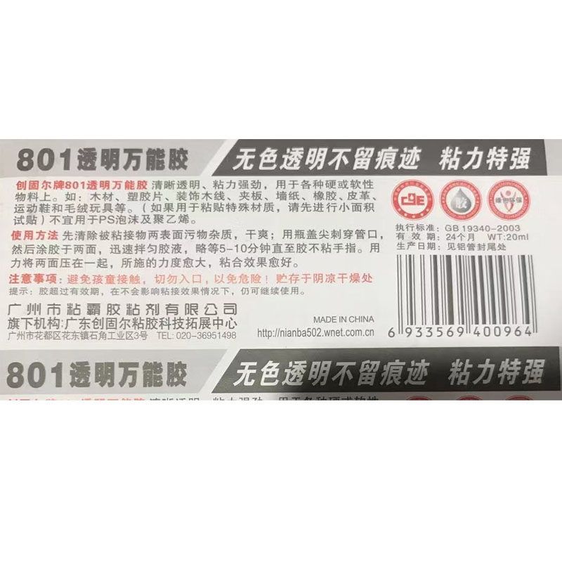 Chuangguer 801 transparent universal glue small branch family pack slow-drying soft universal glue strong glue