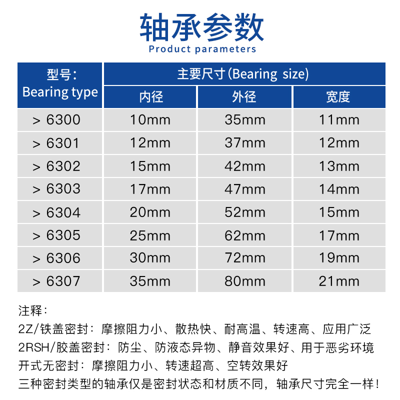 SKF 6300-2Z ---> Iron cover seal SKF 6300-2RS1 ---> Rubber seal SKF 6301-2Z ---> Iron cover seal S
