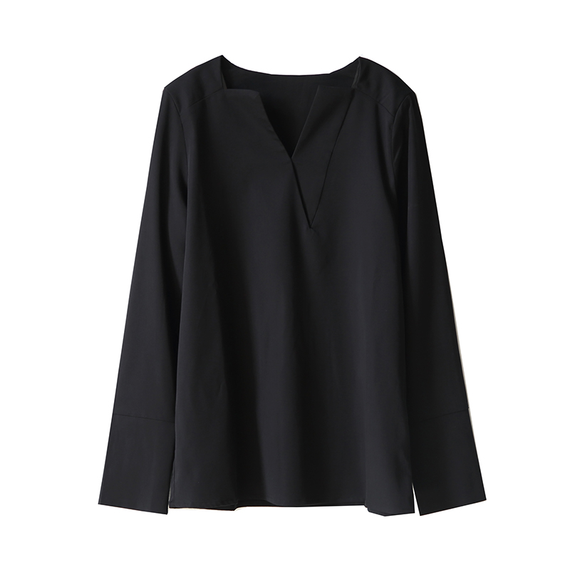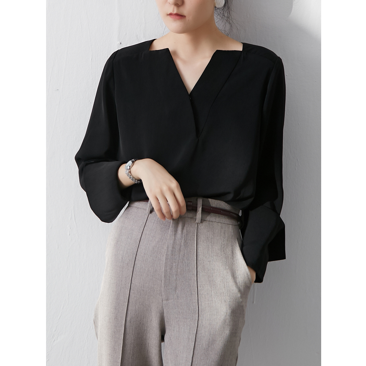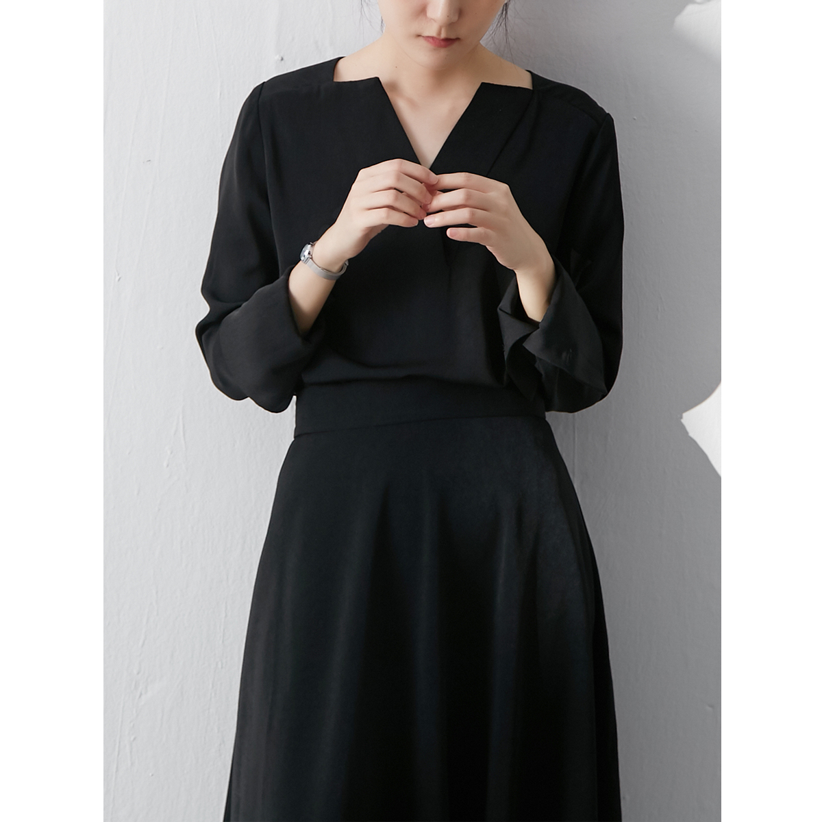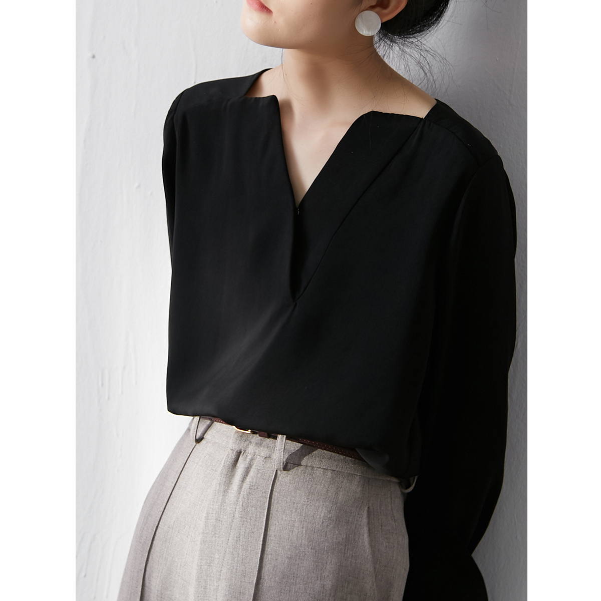 LIMONN Design Sense Satin Black V-collar Sleeve Shirt French Retro Commuter OL Temperance Top