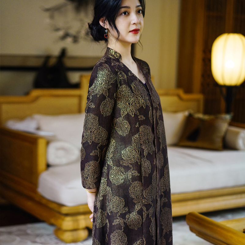 Zhu's original (like fog like rain and wind) gold wire interwoven sweep crepe cloud yarn improved Chinese coat woman
