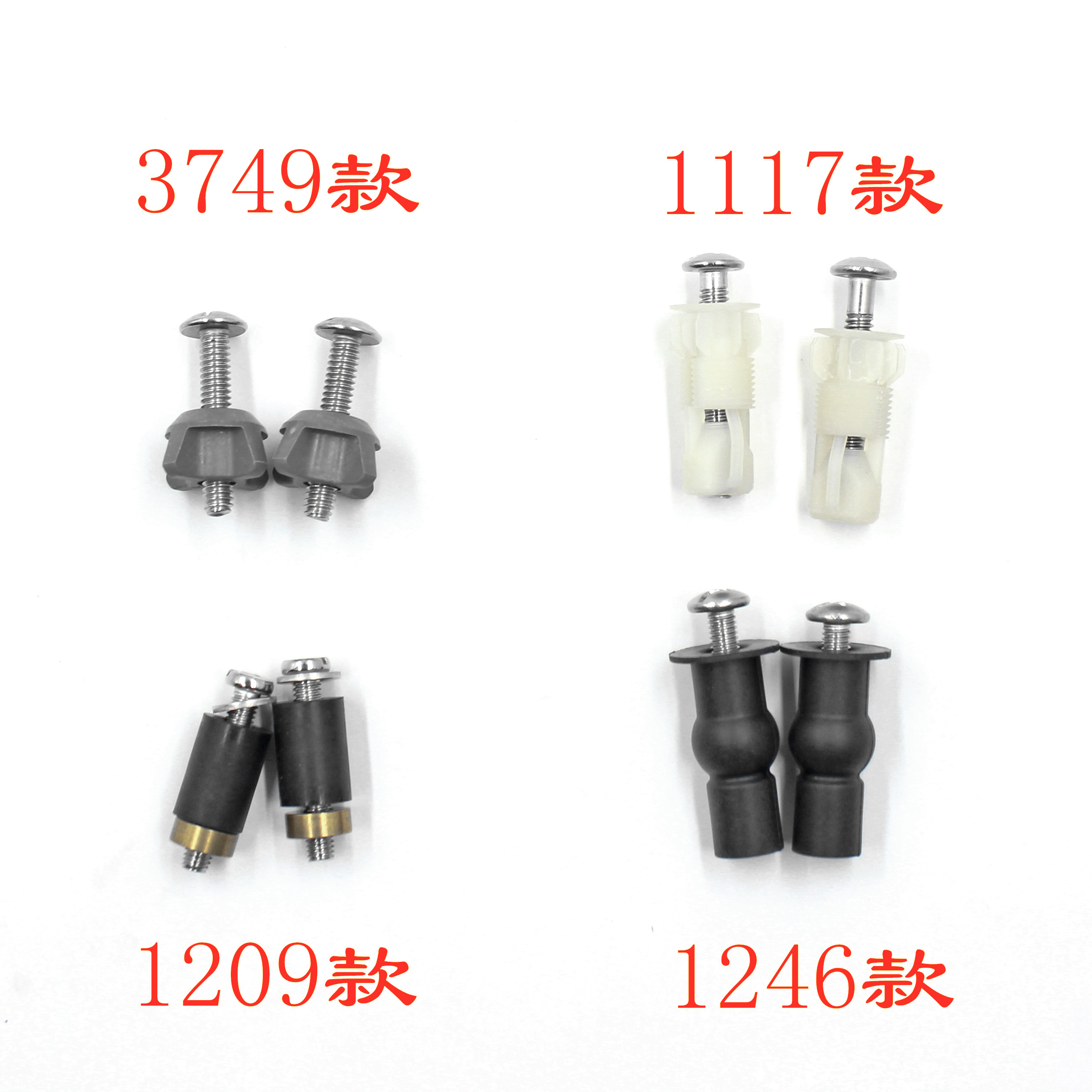 A pair of 3749 gray screws A pair of 1117 nylon screws A pair of 1209 black screws A pair of 1246 black rubber screws A pair of round hole white gaskets A pair of round hole white gaskets