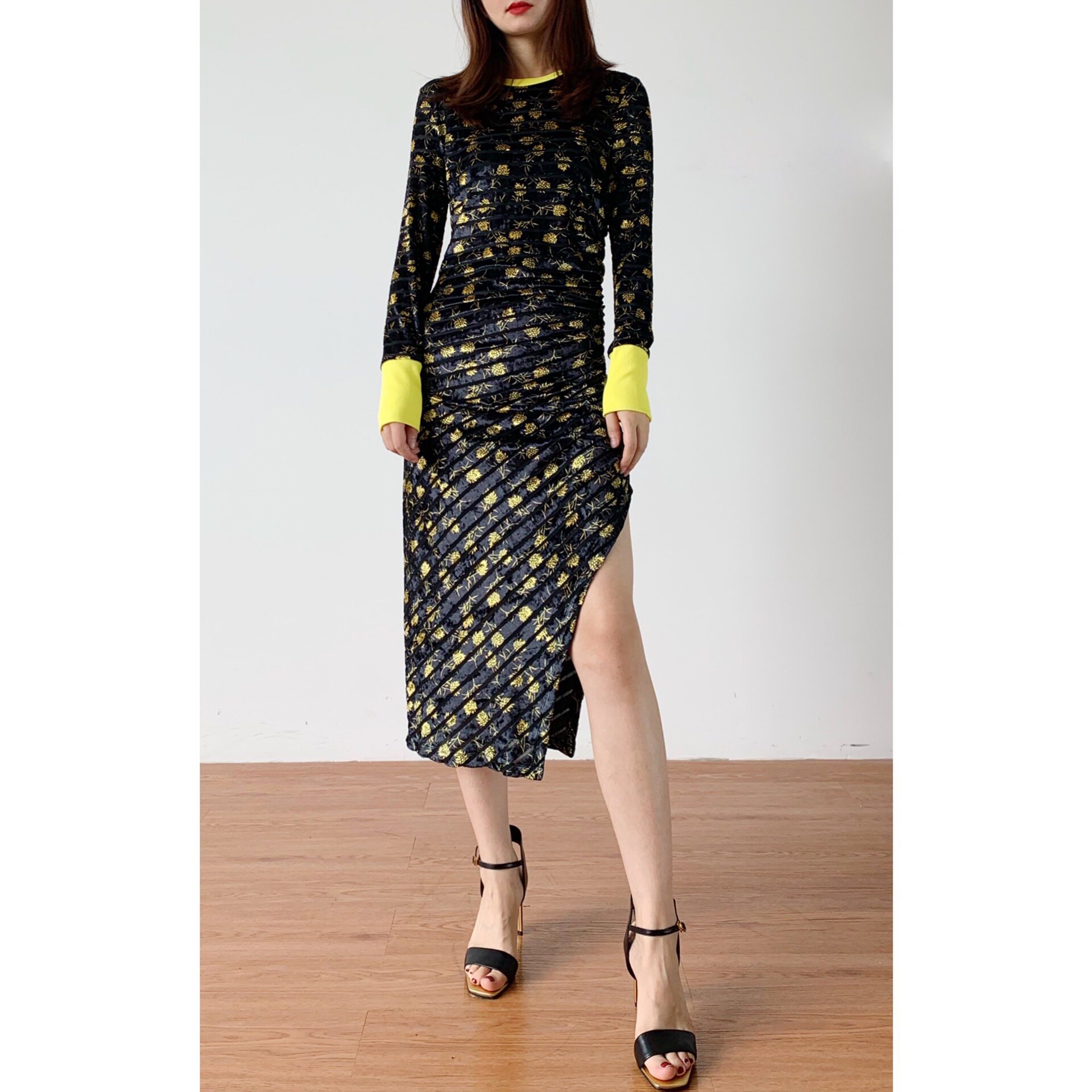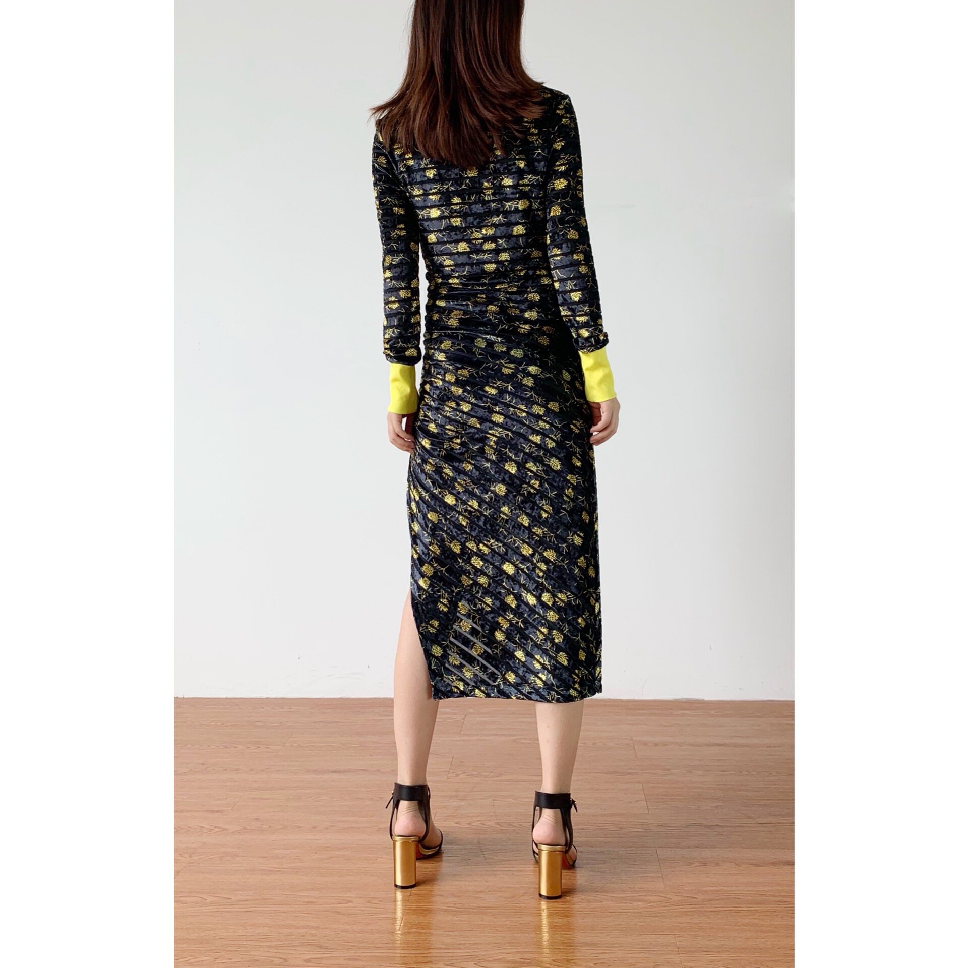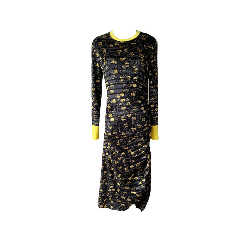 (Rugosa M) Black Long Sleeve Vintage Print Slim Dress Striped Irregular Slit Long Dress Women