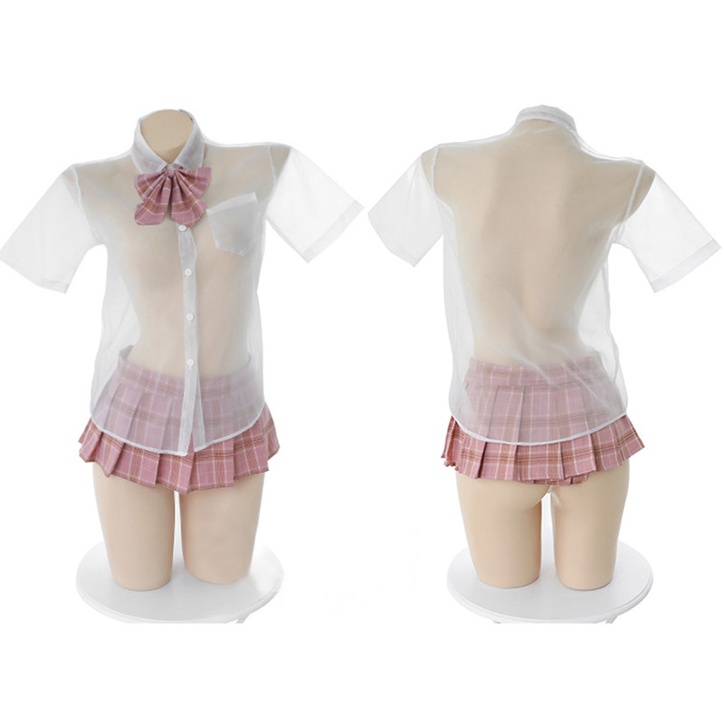 2 Piece of perspective student White shirt transparent white shirt ultra short plaid pleated skirt