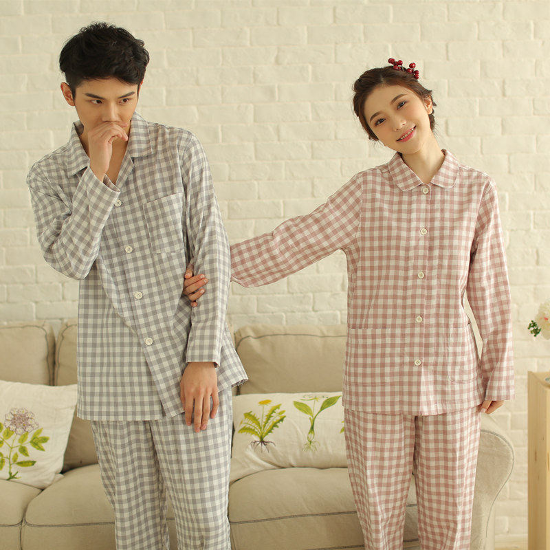 Spring and autumn pure cotton double-layer gauze men and women couple pajamas long-sleeved trousers set soft classic plaid home clothes