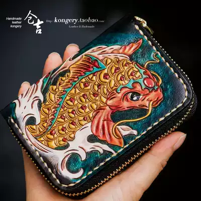Kurayoshi handmade card bag men's and women's short coin purse zipper foreskin carved organ card bag head layer cowhide leather wallet