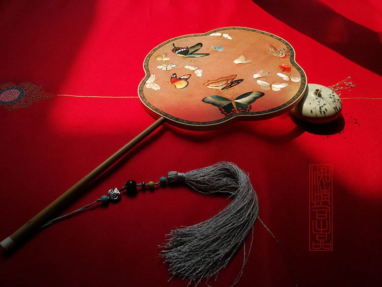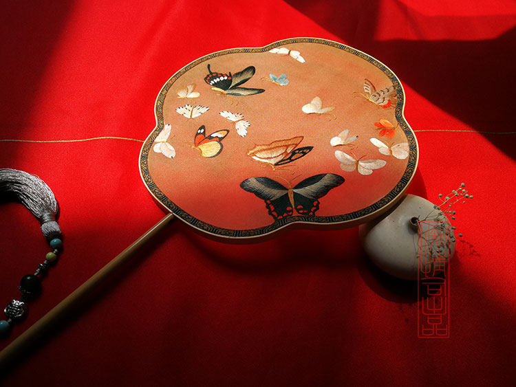 Rental (Infatuation Division) Embroidered Butterfly Suzhou Embroidery Special-shaped Double-sided Embroidered Long-handled Round Fan Palace Fan 1P0068