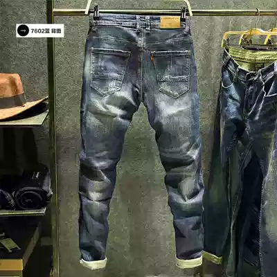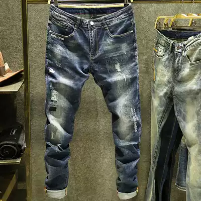 Tide brand retro old beggar hole jeans men Korean fashion elastic slim pipe pants straight long pants