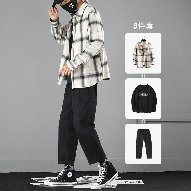 Plaid shirt male long sleeve Korean version trendy spring autumn season shirt ruffling handsome men's outfit set with a handsome and casual suit