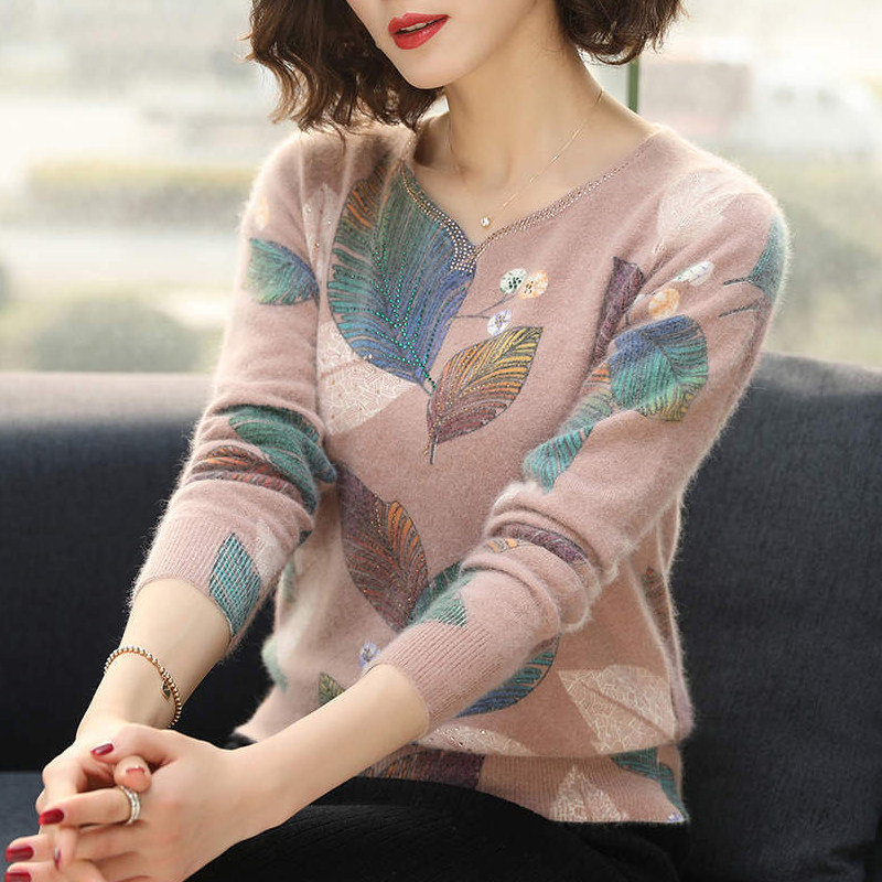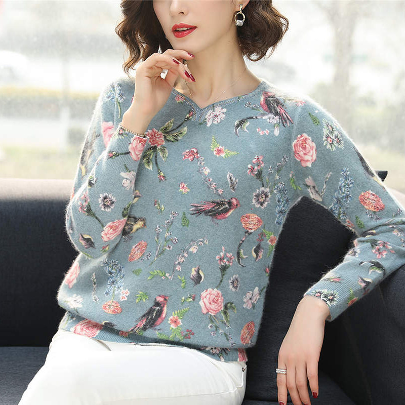 2022 new wool sweater ladies middle-aged printed pullover sweater mother wear knitted cashmere bottoming shirt autumn and winter