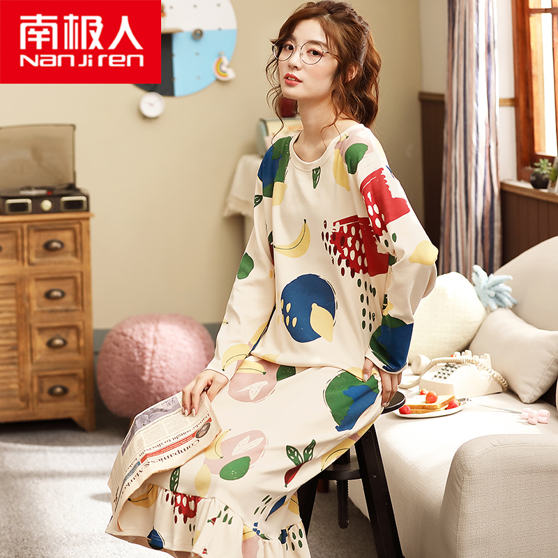 South Pole Sleeping Dress Woman Autumn Winter Pure Cotton Long Sleeve Sleeping Clothes Spring Autumn Season Korean Version Cute Long Version Long Dress Grand size Home Sizes Home Clothes