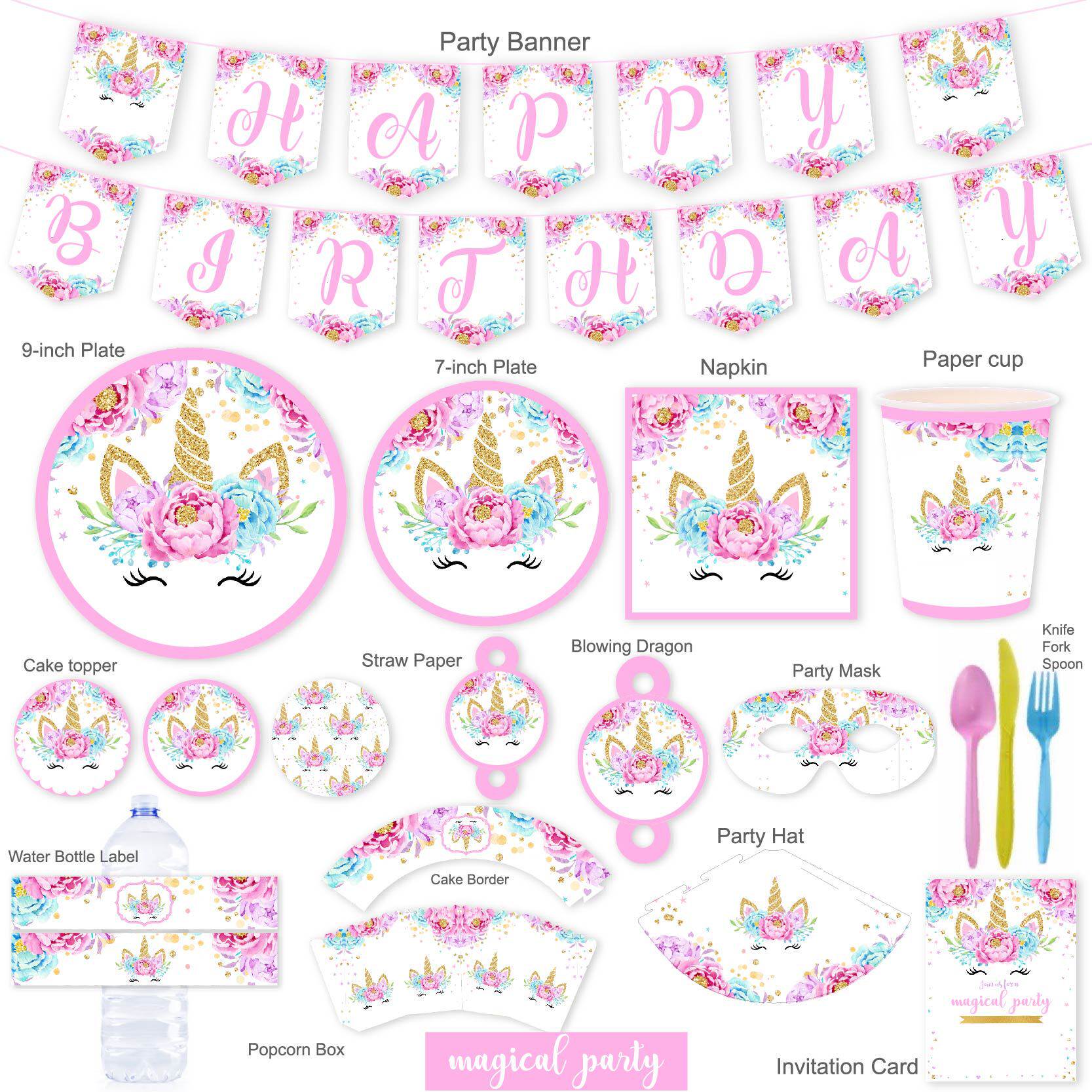 7-inch dinner plate 8 9-inch dinner plates 8 cupcakes 8 Birthday Hats 8 Napkin Paper 16 Straw 8 Branches Invite Cards 8 Sheets Blow Dragon 8 Popcorn Boxes 8 Party Glasses 8 Banners 1 Mineral Water Bottle