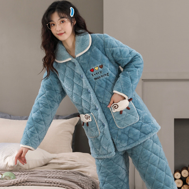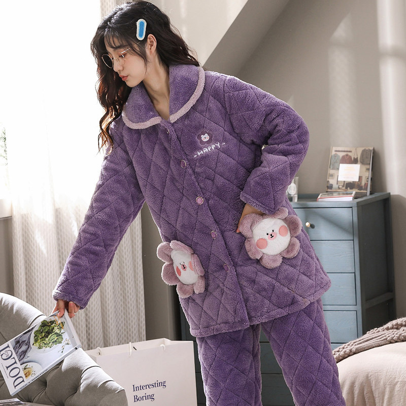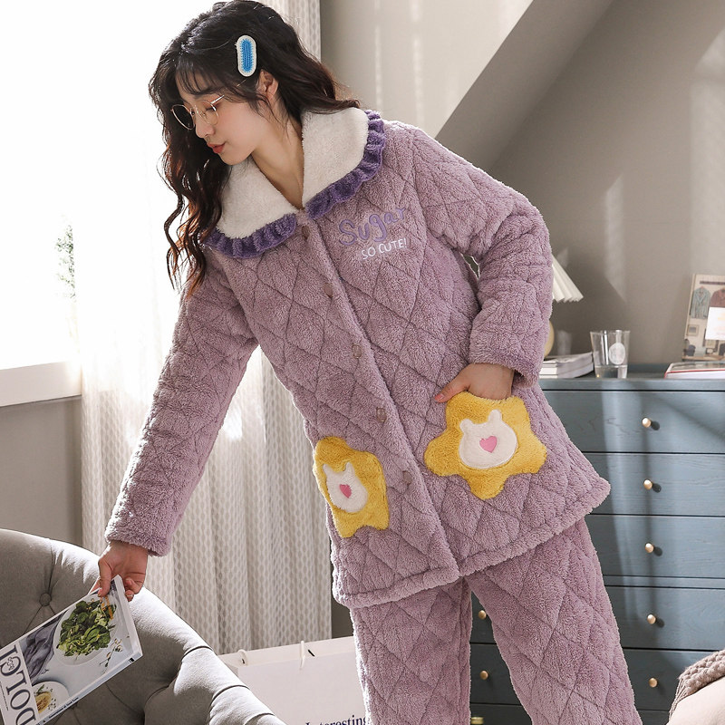 Pajamas woman winter thickened coral velvet flannel suit in autumn winter warm and plus velvet home suit