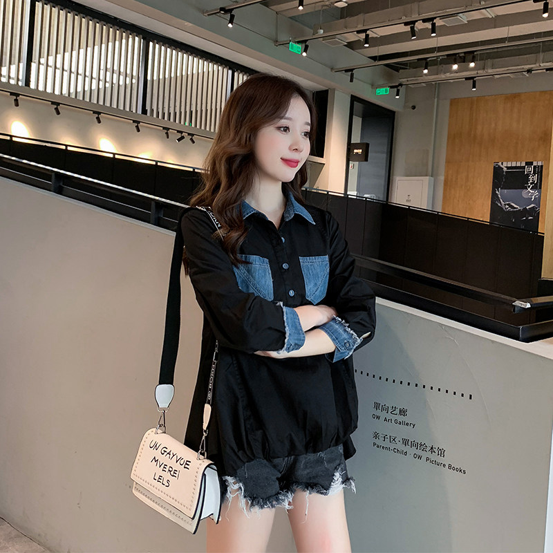 Denim stitching shirt women's design sense niche retro Hong Kong flavor autumn 2022 new long-sleeved loose light cooked top