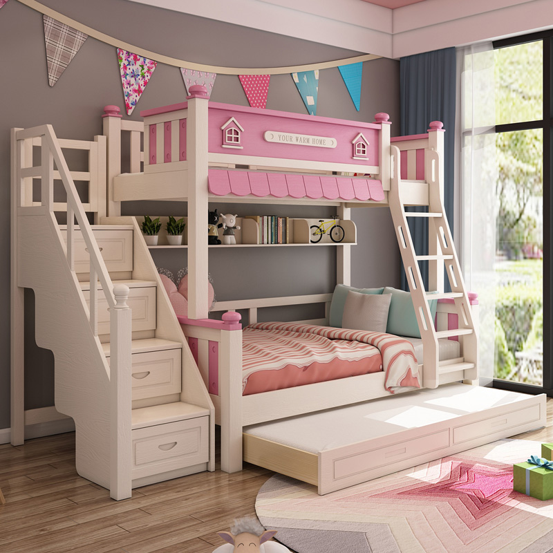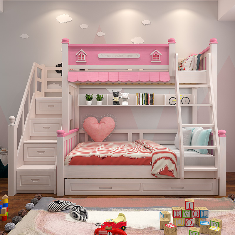 The girl's princess bed upper and lower beds double-layer solid wood children's bed castle dream high and low upper and lower bunk with slide pink