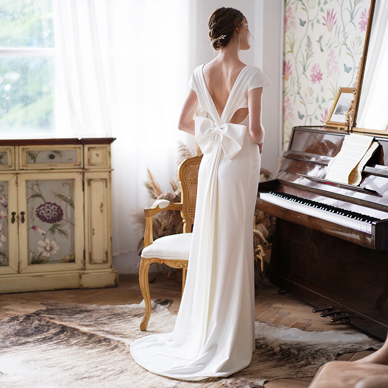 Flower Na bow vintage halter fishtail mopping dress Outdoor lawn wedding photo tour light wedding dress
