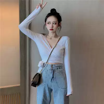Sexy short strappings with umbilical heart machine cross V collar collarbone top female autumn Joker slim long sleeve thin bottom
