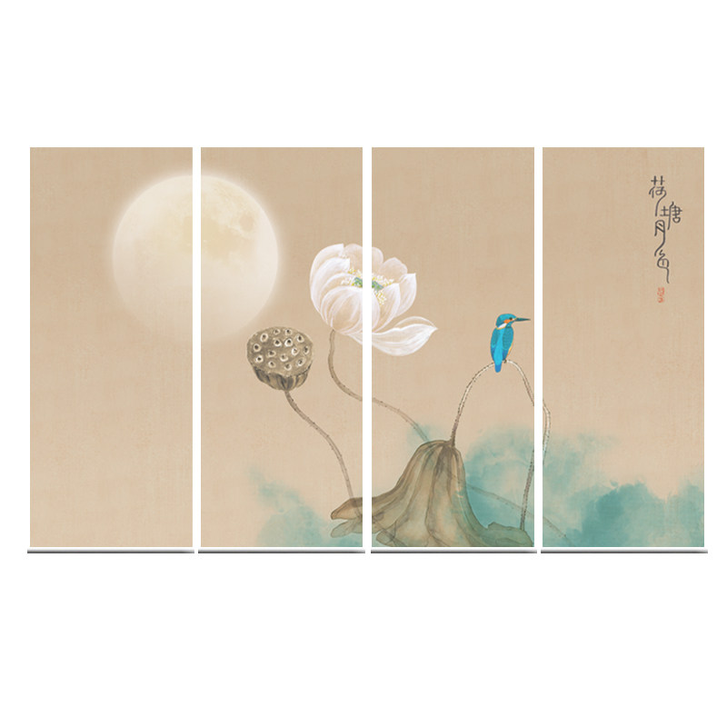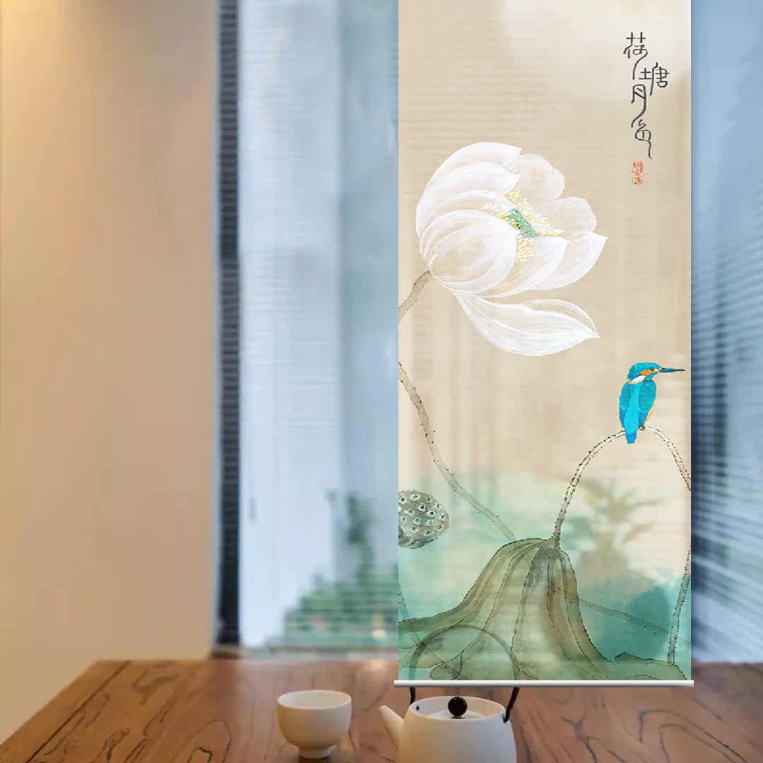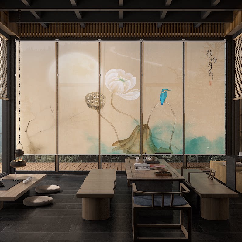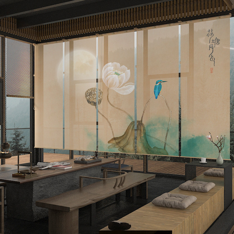 Modern Chinese roller curtain hanging curtain Soft partition Hand-drawn lifting printing semi-transparent roller curtain
