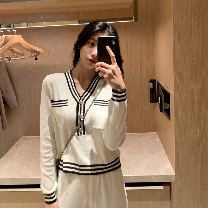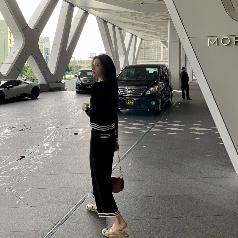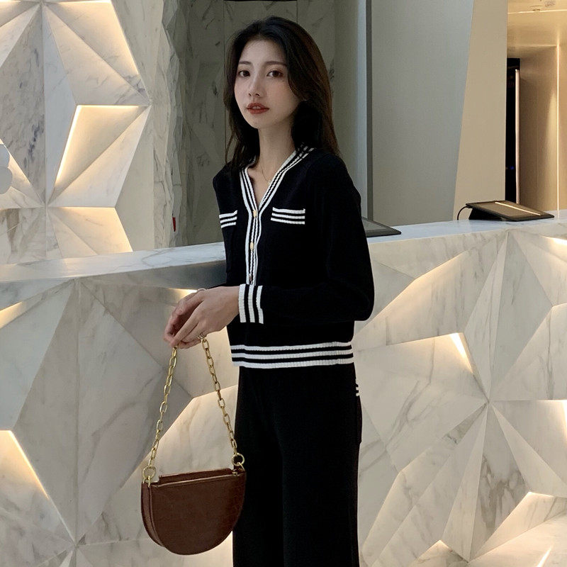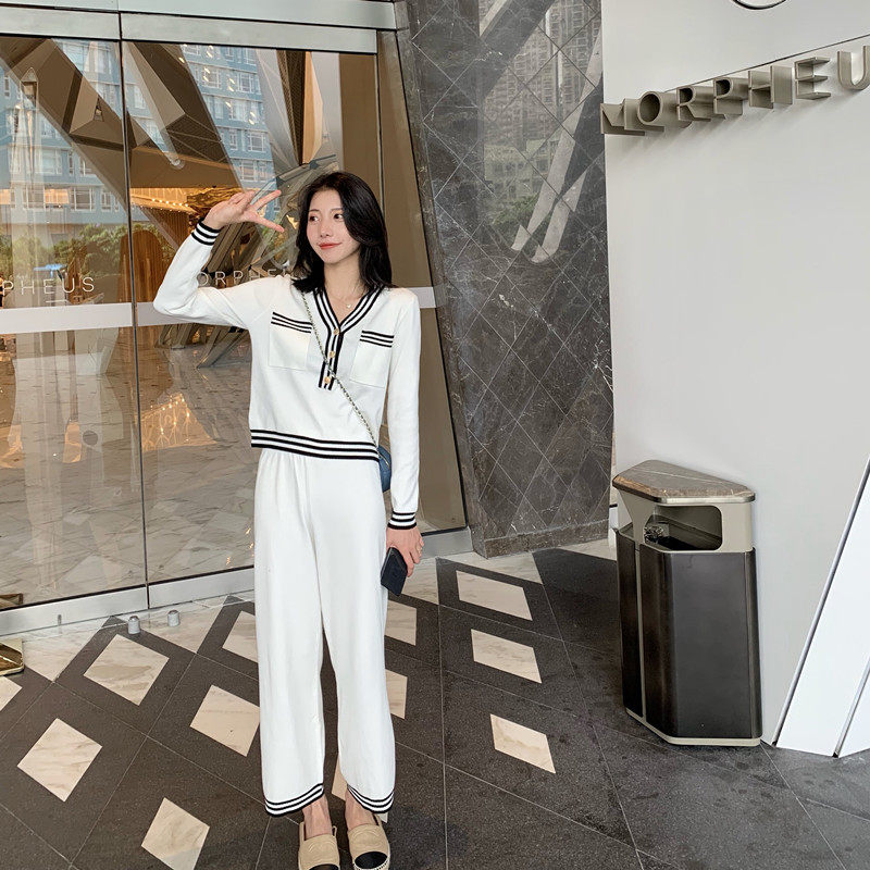 Foreign Trade Cut Mark Net Red Knit New Light Ripening Wind V Collar Ocean Air Minus-Age Wide Leg Pants Casual Two Sets Early Autumn-Taobao