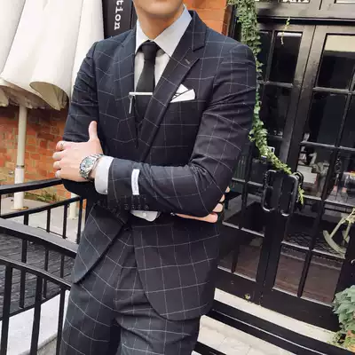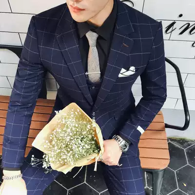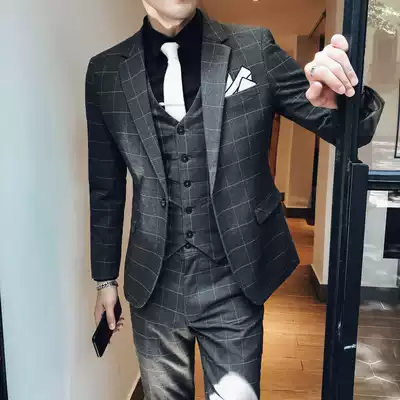 Plaid suit men's suit Korean slim casual small suit three-piece formal work clothes handsome trend single west