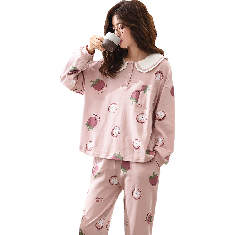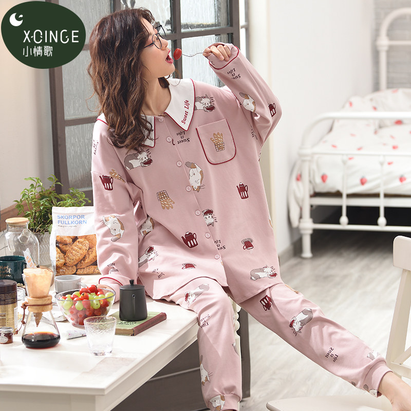 Pajamas women's spring and autumn models pure cotton large size cotton can be worn outside the lapel cute Korean version of autumn and winter homewear suits