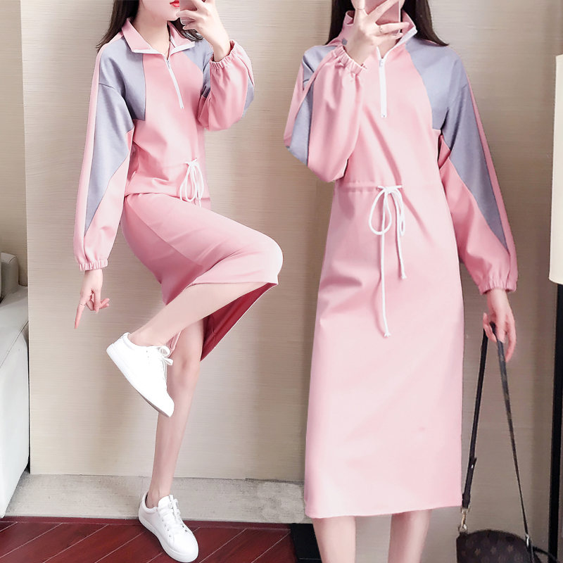 Sweater women's spring and autumn thin section 2019 new loose Korean version long-sleeved half-high collar mid-length waist waist-over-the-knee sweater dress
