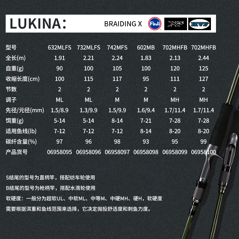 602MB(1 83 m medium adjustment gun handle) 632MLFS(1 91 M medium soft adjustment straight handle) 702MHFB(2 13 m medium hard adjustment gun handle) 732