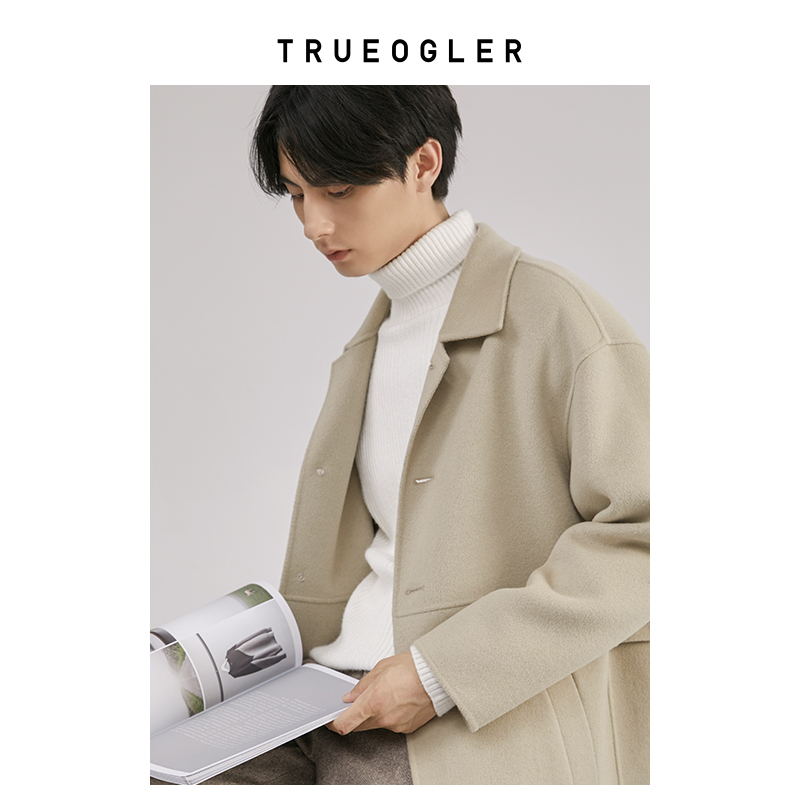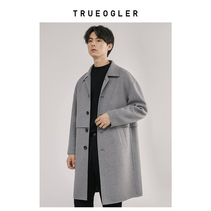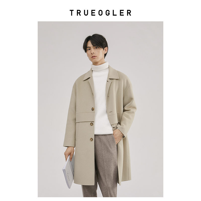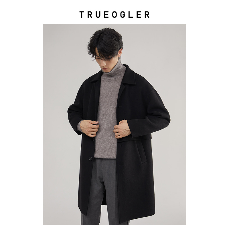 (Storage grid)double-sided wool coat men's medium and long version of non-cashmere lapel loose off-shoulder windbreaker coat top