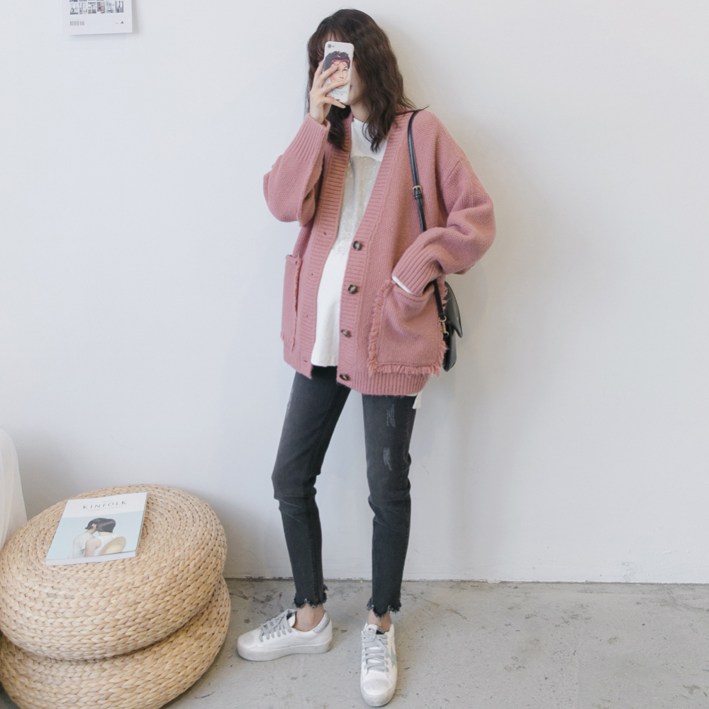 Pregnant women lazy wind sweater cardigan knitted pregnant women spring top medium and long version of the tide mother loose Korean version of the women's coat autumn