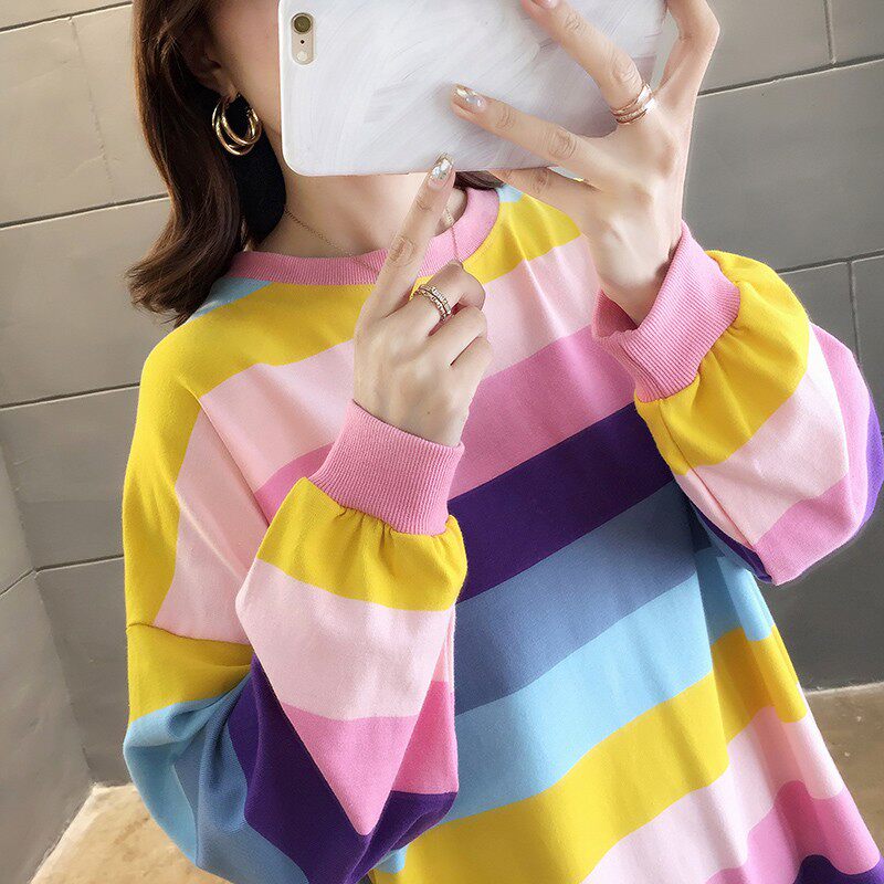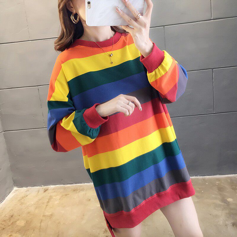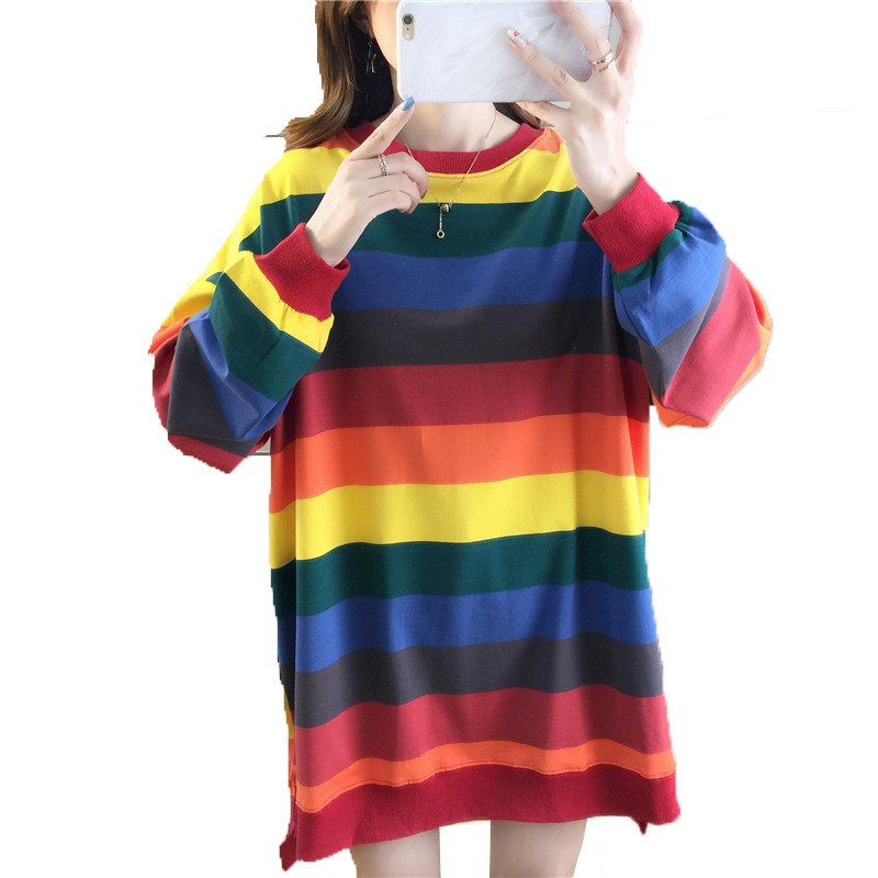 Pregnant woman pure cotton autumn clothing blouses Korean version loose rainbow stripe with long version of round collar large size pregnant woman thin cotton sweater