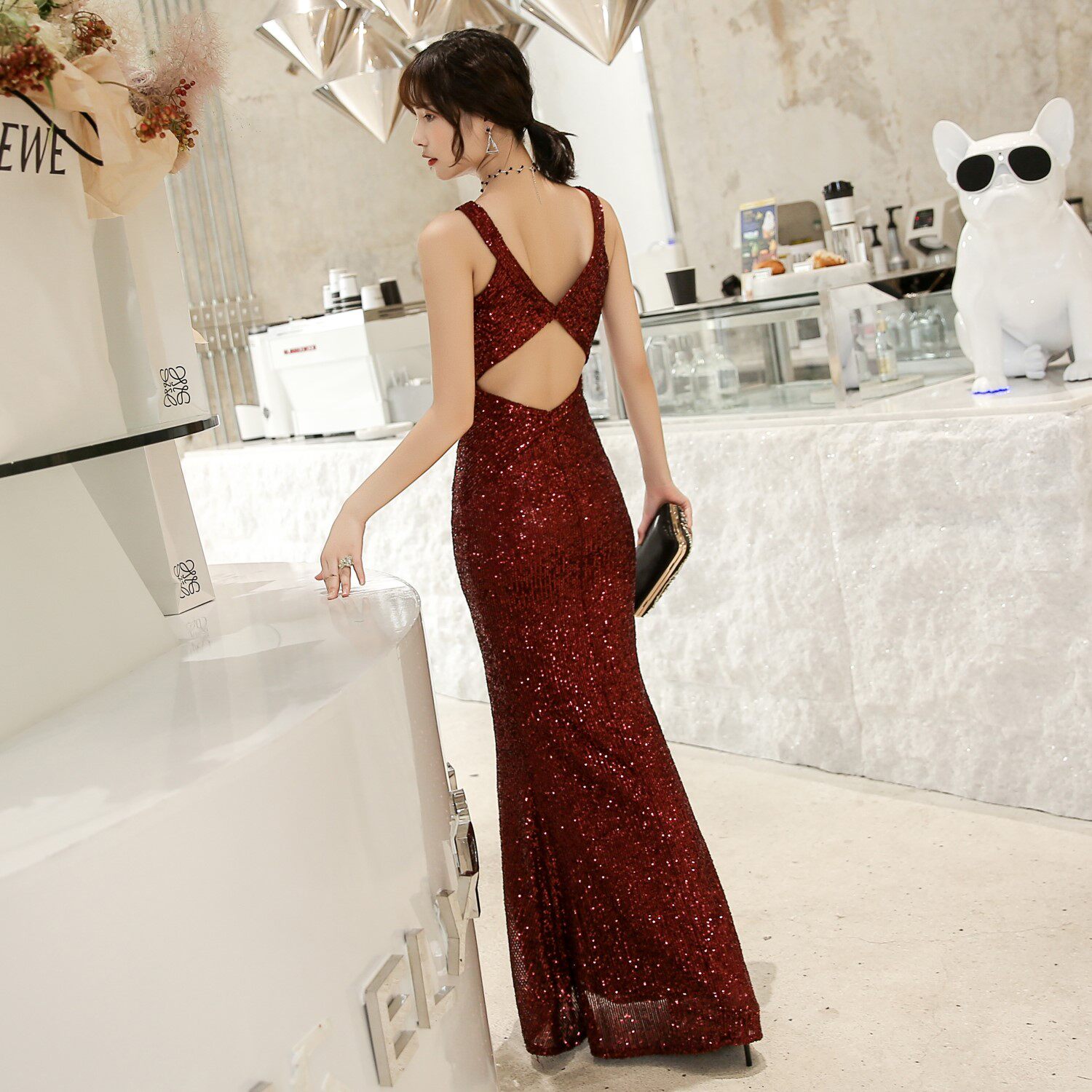 Red toast dress 2021 new banquet host annual meeting sequins backless evening dress skirt femininity dress