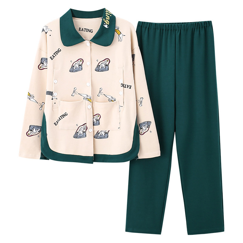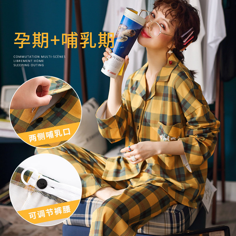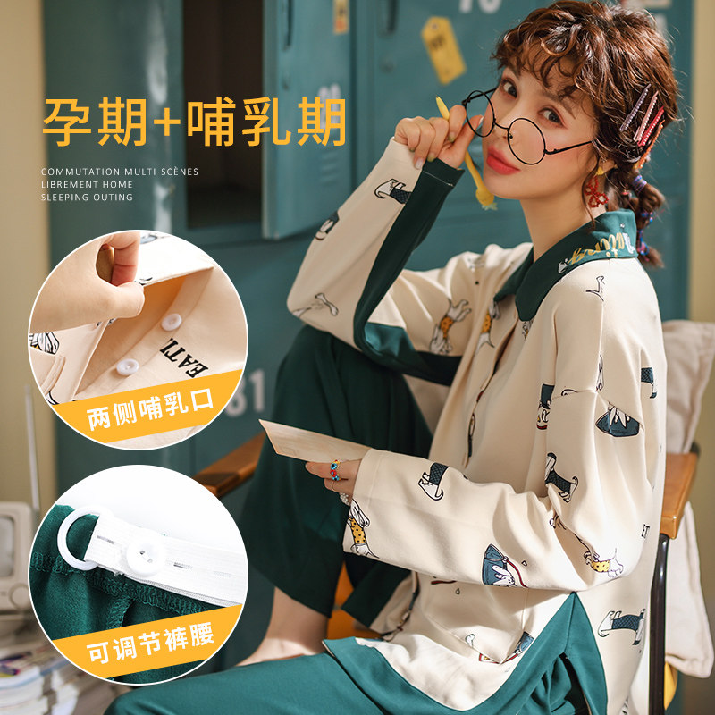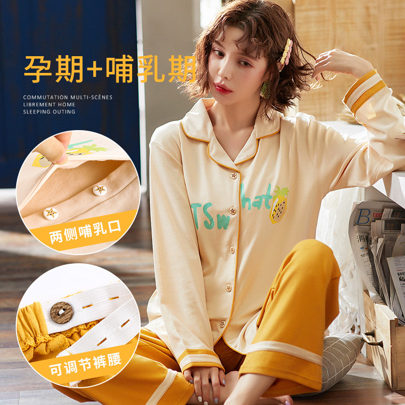 Long-sleeved maternity pajamas Women's spring and summer adjustment pants cotton moon zi large size 200 pounds postpartum nursing clothes with breast pad