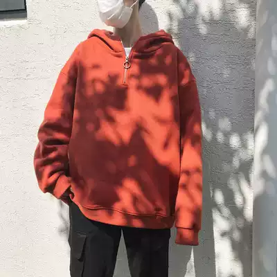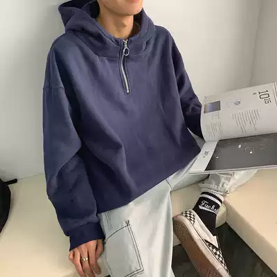 Korean trend plus velvet solid color hooded sweatshirt ins harbor wind bf loose sports autumn men's pullover coat Blue