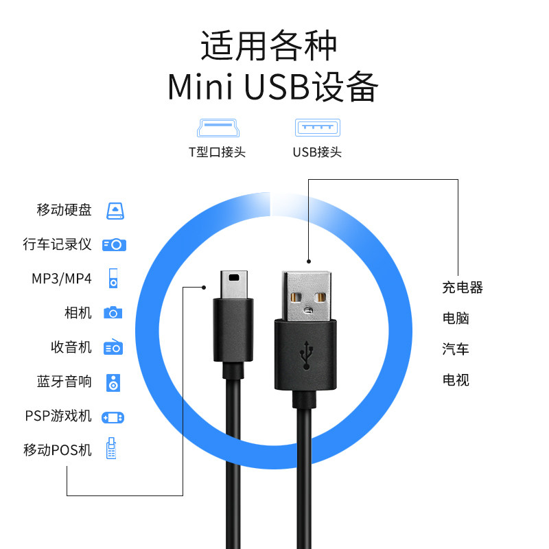 Can adapt to mini trapezoidal port usb old old data cable universal portable hard disk mp3v3 radio 4 car driving recorder camera elderly power charging line t-port