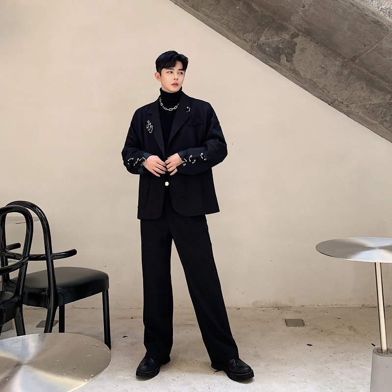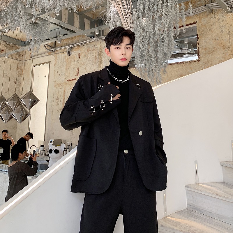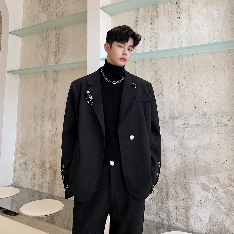 Spring and autumn hair stylist personality loose black suit jacket male iron ring decoration ins temperament wild suit male