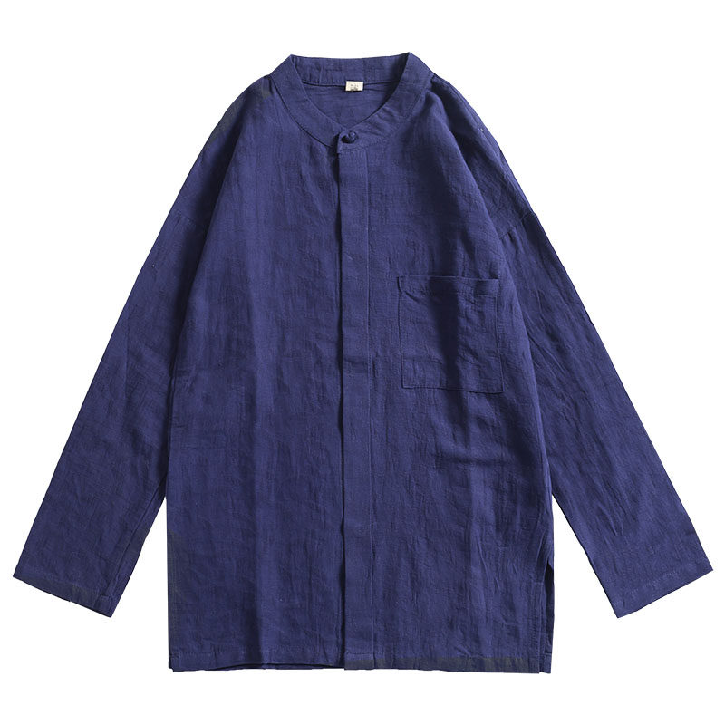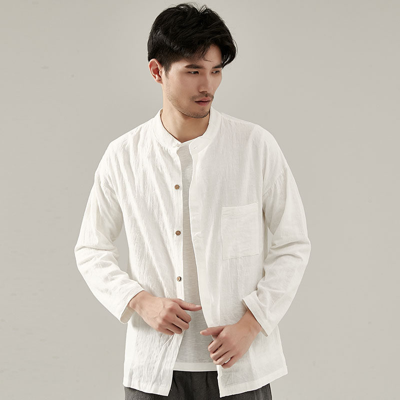 Chinese National style Tang dress plate buckle linen cotton long-sleeved stand collar loose casual retro white outside wear shirt men's ancient style