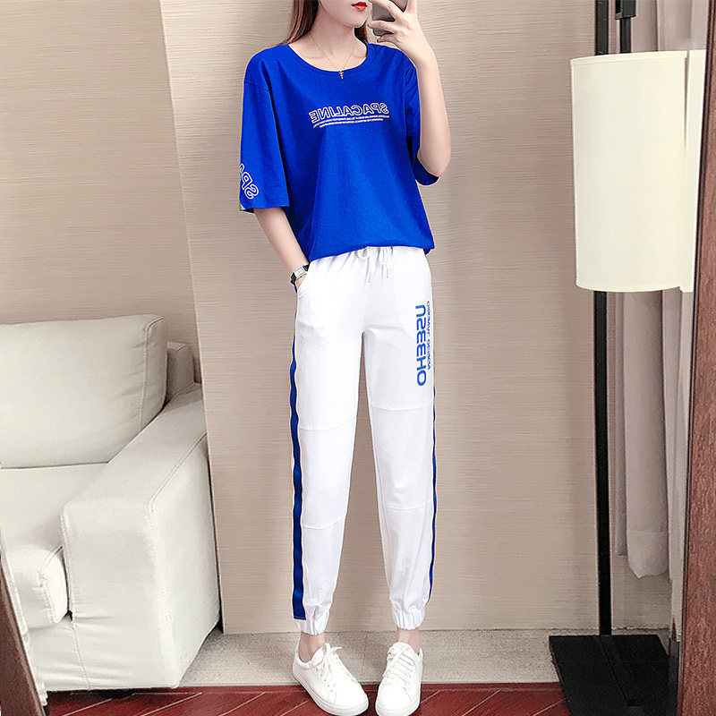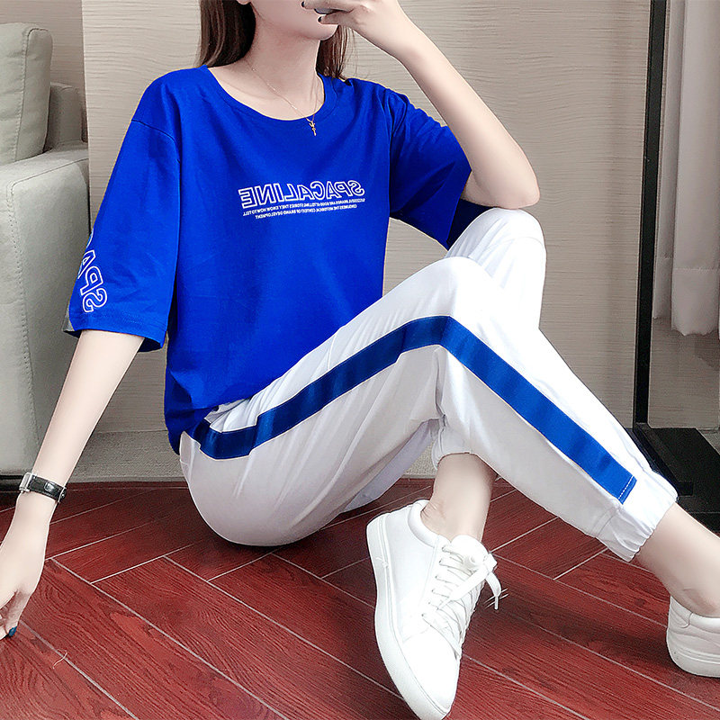 Casual sports suit female summer 2022 new blue short-sleeved loose Western style shuffle sportswear two-piece suit