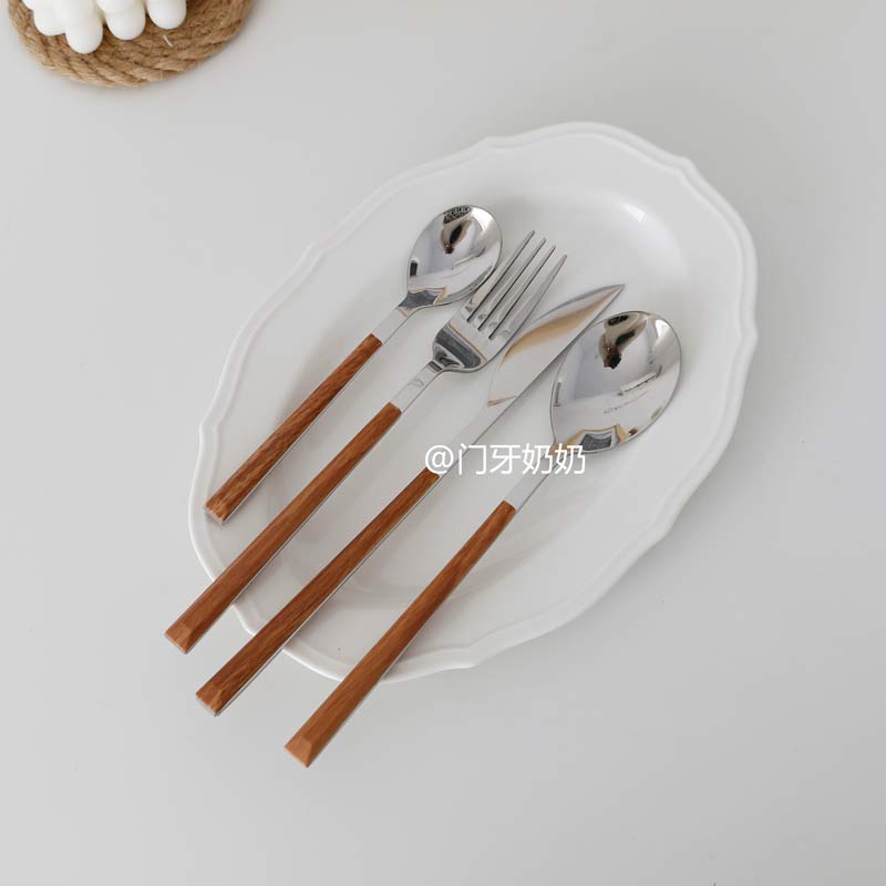 Japan and Korea ins Antique wood handle stainless steel knife and fork tableware set Dessert fork Ice cream spoon Spaghetti fork Japanese soup spoon
