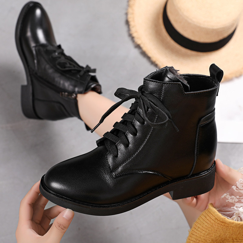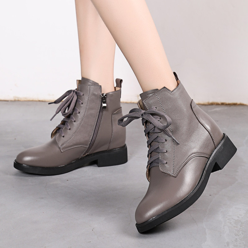 2022 Spring and Autumn Leather Flat Short Boots Flat Heel British Style Martin Boots Large Size Soft Sole Lace Up Women's Boots Grey Single Boots