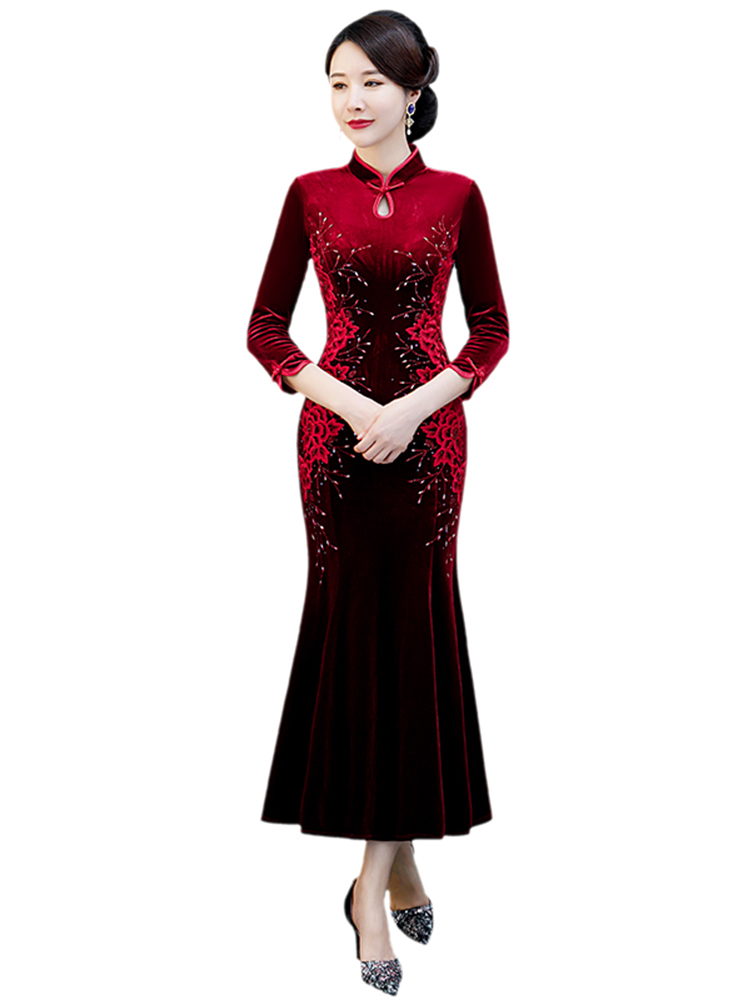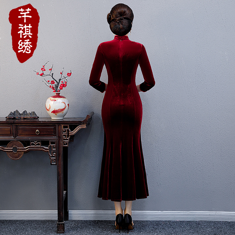 Heavy Engineering Embroidery Gold Velvet Improved Qipao Fish Tail Skirt Long Version Noble 2021 Spring Autumn Walk Show Middle-aged Mom Gown