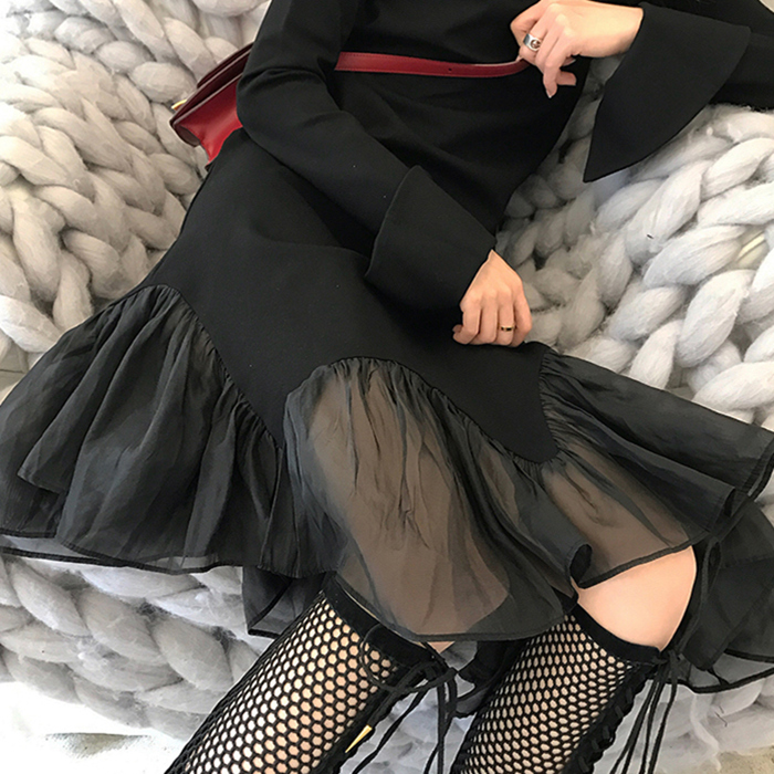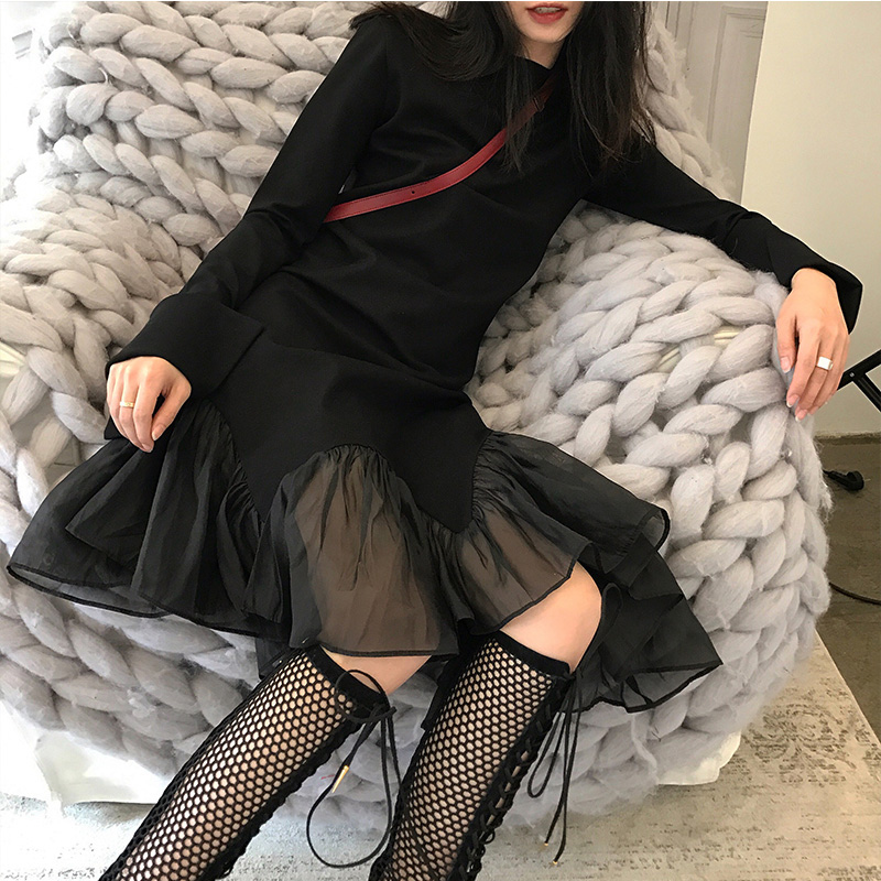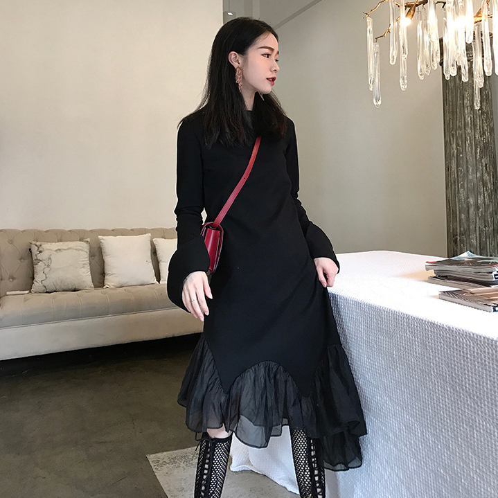 Early autumn new very fairy French niche slim slim dress net red retro knee-length Hepburn style little black dress