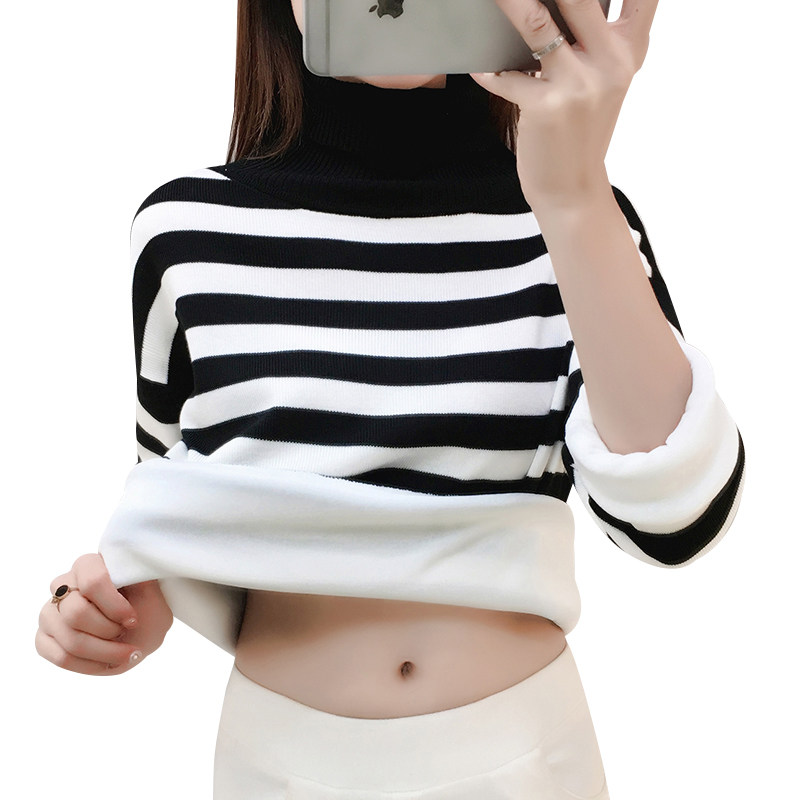 Knitted blouse girl long sleeve high collar stripes plus thicken fitting sweater female autumn and winter 2019 new style