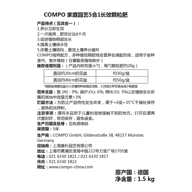 COMPO Germany Import Home Horticulture Five-in-one long-lasting granules controlled release multivariate composite general grain fertilizer