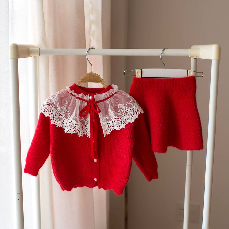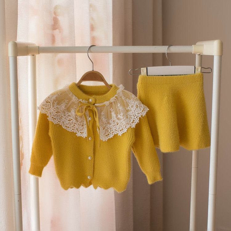 Spring autumn new small and small girl baby sweater knitted suit sweater short dress Two sets of foreign bladed cardiovert jacket