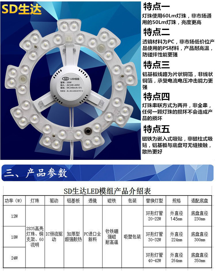 12W module white light (instead of 22w ring tube) 18W module white light (instead of 32w ring tube) 24W module white light (instead of 40w ring tube) 24W module two-color light (