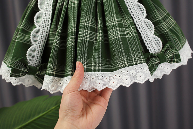 Green Plaid Dress Black Lace Puff Sleeve Dress