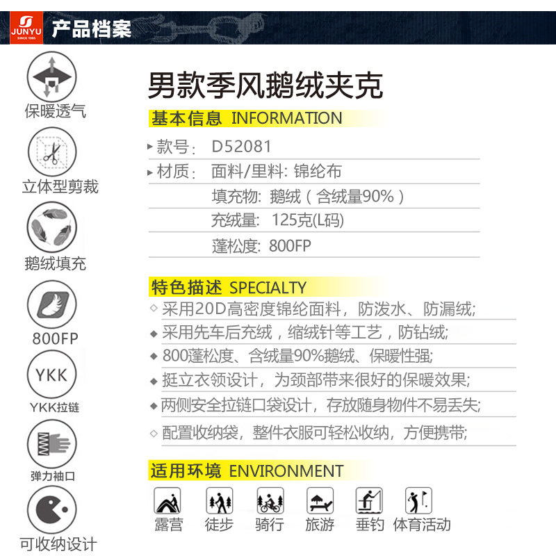 Junyu outdoor goose down down jacket men's 800 fluffy winter thickened stand-up collar lightweight cold-proof warm down jacket