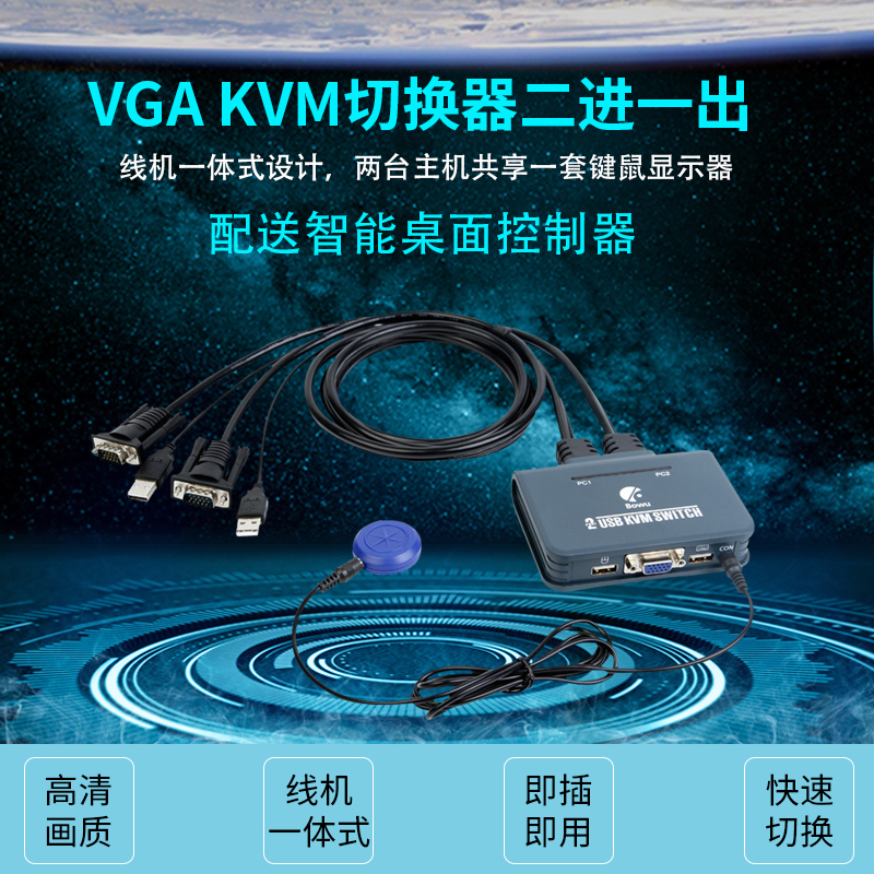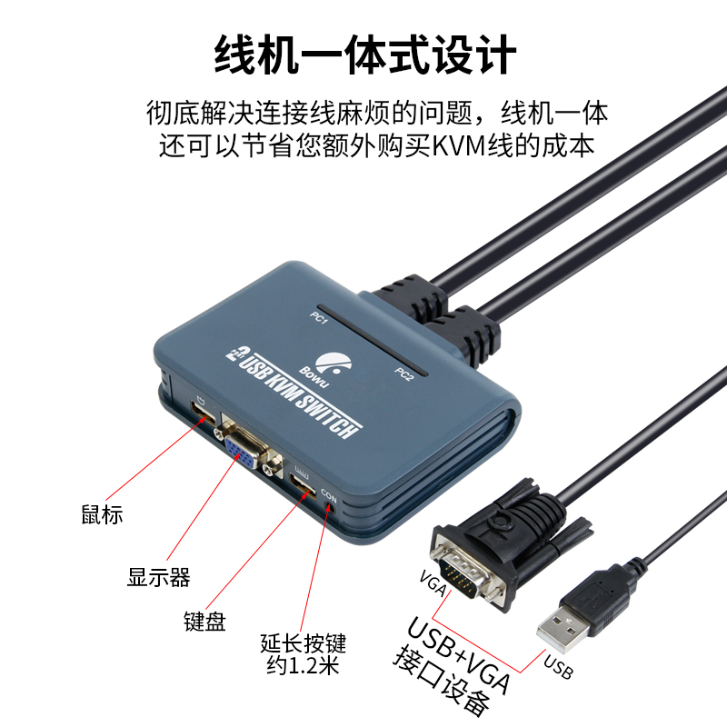 BOWU KVM switch 2-port VGA switcher 2-in-1-out multi-computer usb keyboard mouse sharer key type 2-port synchronous controller one-to-drag two-line machine integrated HD 1080P