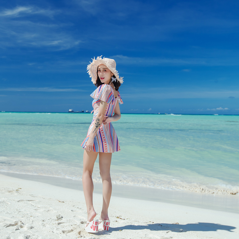 Korean version split flat Angle show thin cover belly skirt swimsuit female sense size chest gathered short sleeves INS wind swimsuit